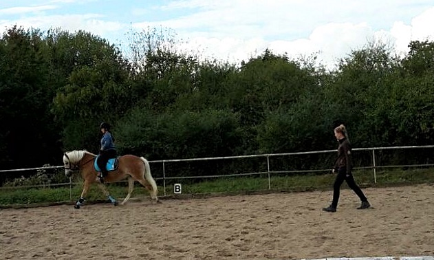 Mit erwachsenden Reitern arbeite ich grundsätzlich erst einmal die Grundbegriffe wie halbe und ganze Paraden, Stellung und Biegung, Anlehnung und die Bewegung des Pferdes und der daraus resultierenden Bewegung des Reiterbeckens auf. Diese Grundlagen sind essentiell für die korrekte Hilfengebung und einen korrekten Sitz.